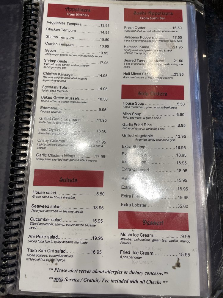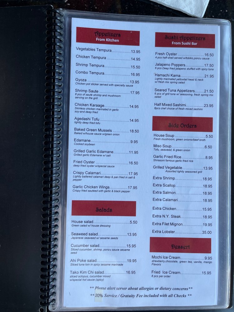 Shirasoni Japanese Restaurant in Alameda offers a diverse menu with options for vegetarians, vegans, and meat lovers alike. This casual dining spot provides a welcoming atmosphere with excellent customer service. From appetizers like tempura and gyoza to flavorful salads and soups, Shirasoni delivers on taste and variety. Their side orders, like garlic fried rice and grilled vegetables, complement their main dishes perfectly. Customers rave about the teppanyaki experience, where chefs entertain while preparing dishes like lobster and steak. The wide array of sushi rolls keeps guests coming back for more. With friendly staff, a roomy setting, and a vast menu to explore, Shirasoni Japanese Restaurant promises a memorable dining experience.